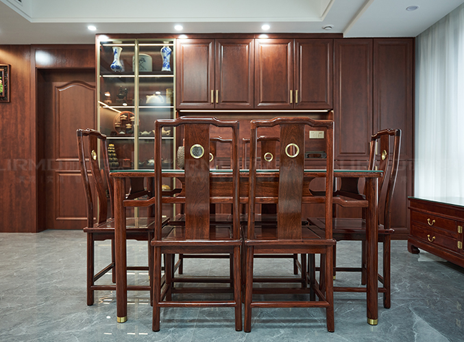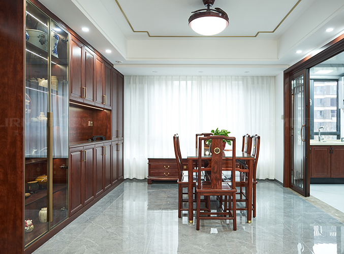 一整墻餐邊柜,中間臺面預留了插座,可放置一些小家電,玻璃柜門放茶具和瓷器等裝飾,