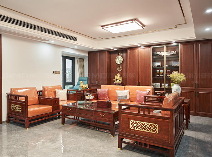 超大開間客廳背景墻用來做裝飾柜,玻璃門內嵌燈帶穿插格柵板設計,高級感一下就出來了。