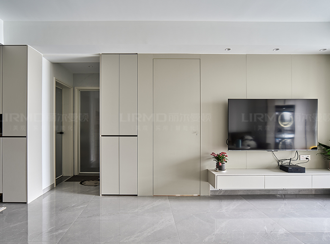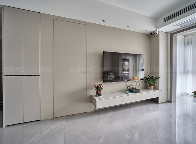 采用600乘1米2大地磚通鋪,上方做無(wú)主燈設(shè)計(jì)更顯極簡(jiǎn),電視背景前儲(chǔ)物柜,內(nèi)嵌式設(shè)計(jì),