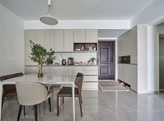 一整排的餐邊柜,中間部分可以做一個(gè)水吧臺(tái)的使用,背板和臺(tái)面均是巖板材質(zhì),更顯高級(jí)感。