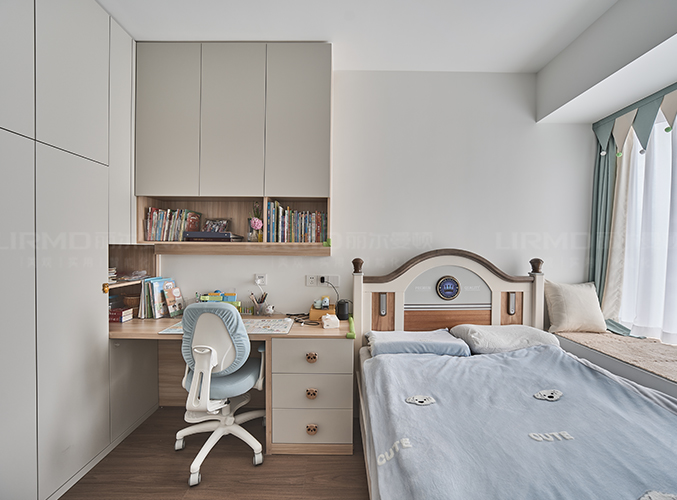 采用衣柜書桌一體設(shè)計(jì),既能儲(chǔ)物又能學(xué)習(xí)。