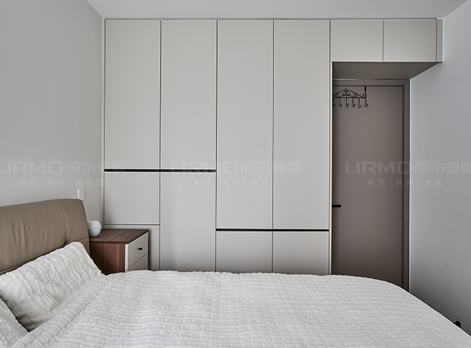 和墻面平齊,不占空間的同時(shí)收納更加方便,右邊通往小孩房的隱形門設(shè)計(jì),