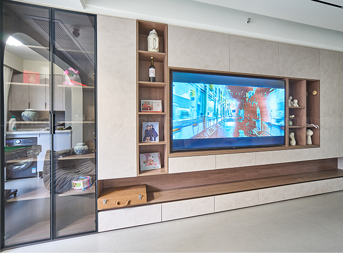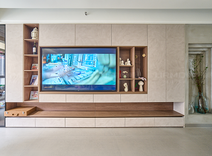 整屋通鋪瓷磚,盡顯大氣,電視背景墻設(shè)計幾盒壁龕放置擺件,與嵌入式電視柜融為一體,