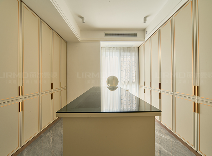 整面墻做衣柜,更加好分類,柜子象牙灰色鑲嵌金屬邊框,側邊做一個圓弧角處理,