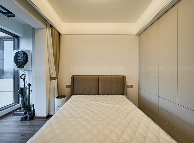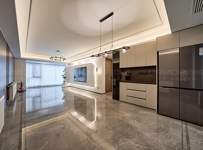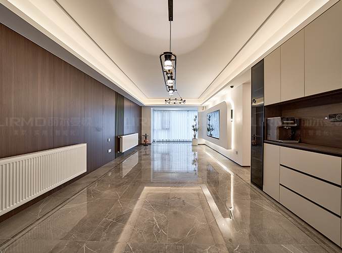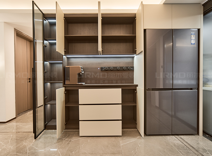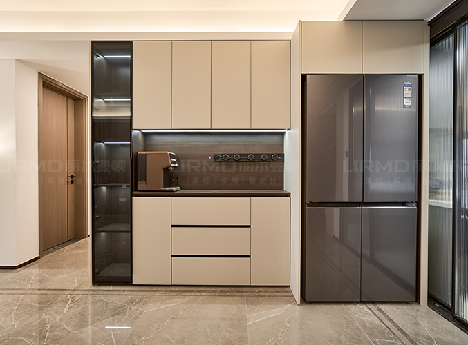 整體的墻柜很好的利用空間,收納大大的提升,內嵌式冰箱設計,不占空間,