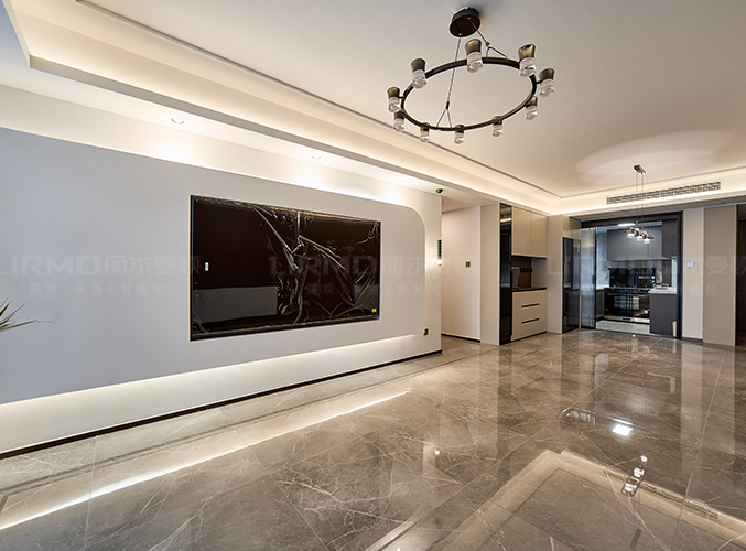 整墻做內嵌電視背景墻,疊級吊頂+射燈營造輕奢氛圍,白色石膏板電視墻搭配木制背景墻簡潔大方。