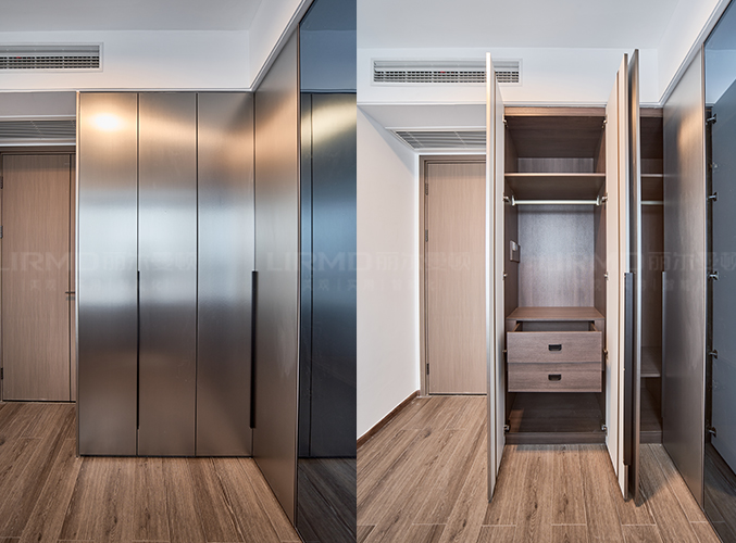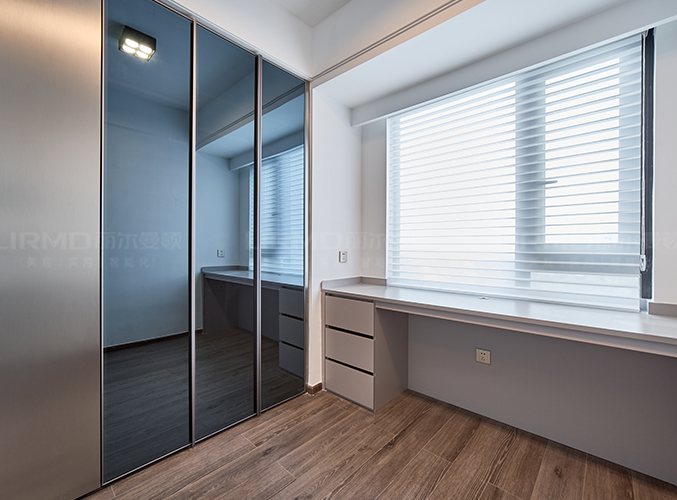 衣帽間做L型衣柜+一門到頂設計,三面柜門做落地穿衣鏡功能性十足。
