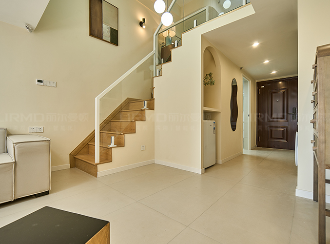 全木地板樓梯設計,安裝簡約風球型吊燈,體現復古藝術感。