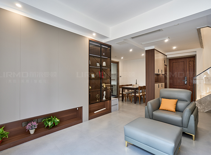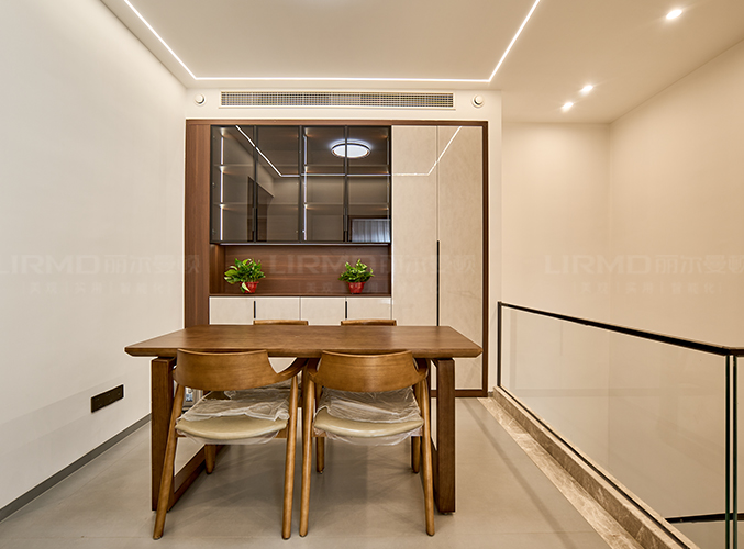 二樓樓梯口裝整墻餐邊柜,方便收納。