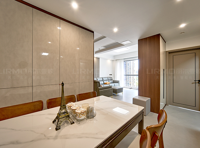 整屋通鋪瓷磚,盡顯大氣,電視背景墻采用整面墻設(shè)計,整體效果不顯沉悶,
