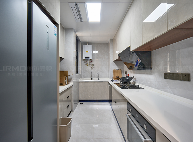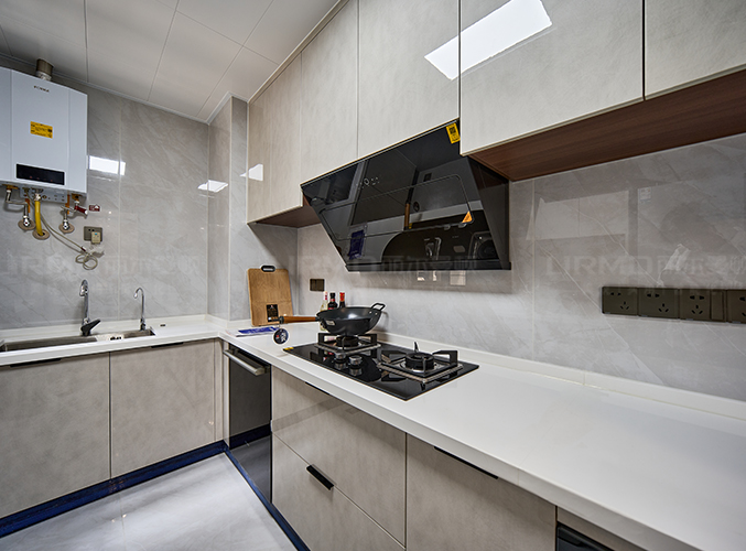 上下方都有收納柜,視覺層次更加豐富,搭配大理石臺面美觀又實用,內(nèi)嵌式冰箱設(shè)計,不占空間。