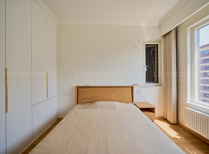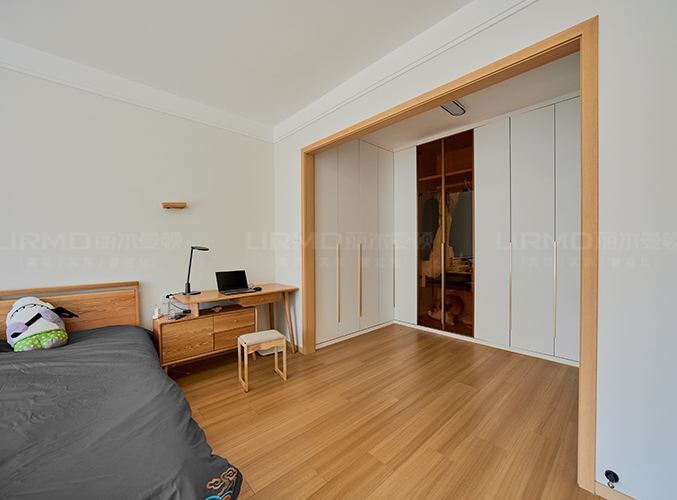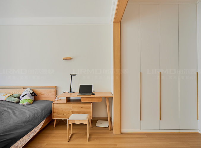 臥室整體原木+奶白,實木柜體搭配PET膚感柜門,一門到頂,質感超不錯,