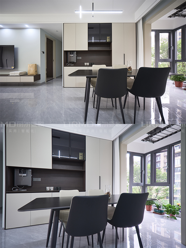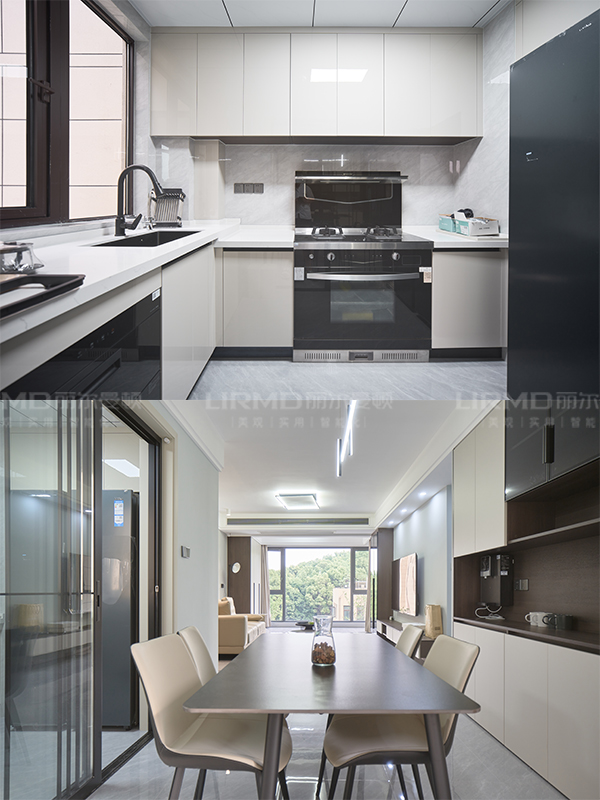 全房共定制了10個柜子,柜體采用足18厚杉木芯板,柜門采用LSB板PET膚感柜門,一門到頂,五金使用原裝進口的百隆五金