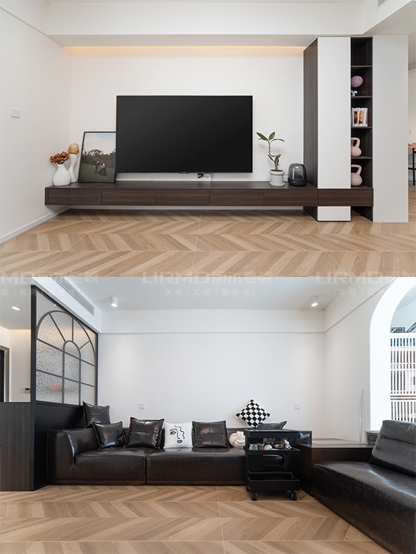 【入戶柜】 柜體:煙熏橡木 柜門:琥珀白 【客廳】 硬裝大面積的奶茶色+小面積胡桃木色 都是暖色系的搭配起來還有點復古的味道 軟裝飾品的點綴讓家看起來更有質感