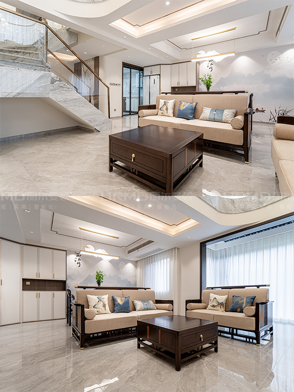挑空的客廳江兩層的建筑空間打通,以中式葵紋為靈感、以國畫山水大理石做背景