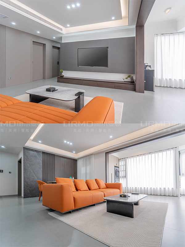 ?沙發背景墻與電視背景墻同顏色、同材質、同款式一體式設計,增添空間立體感。
