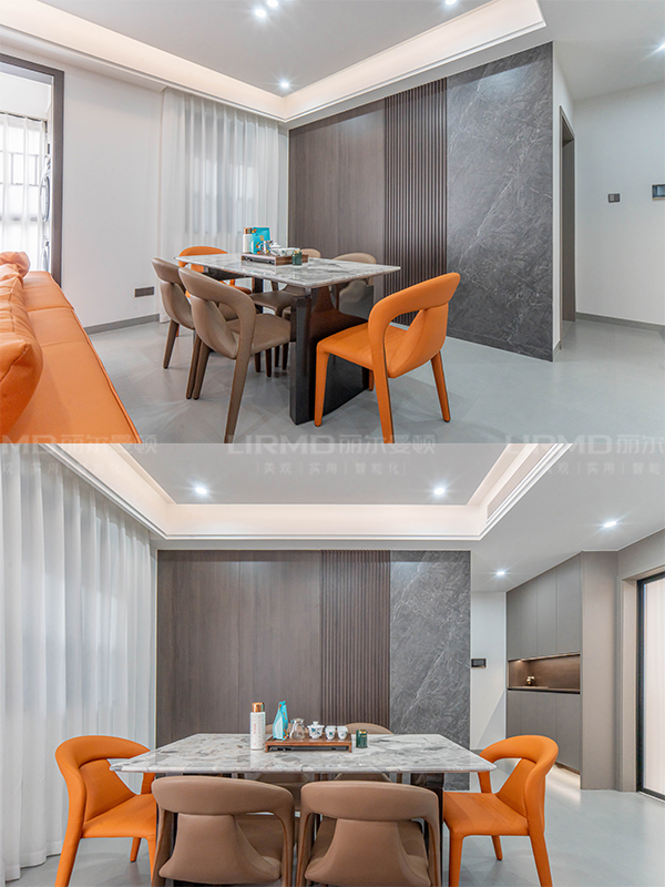 ?電視墻懸浮設計,讓客餐廳空間產生了互通性,電視機嵌入式設計,插座電線都被隱藏在電視機后,讓空間高級起來