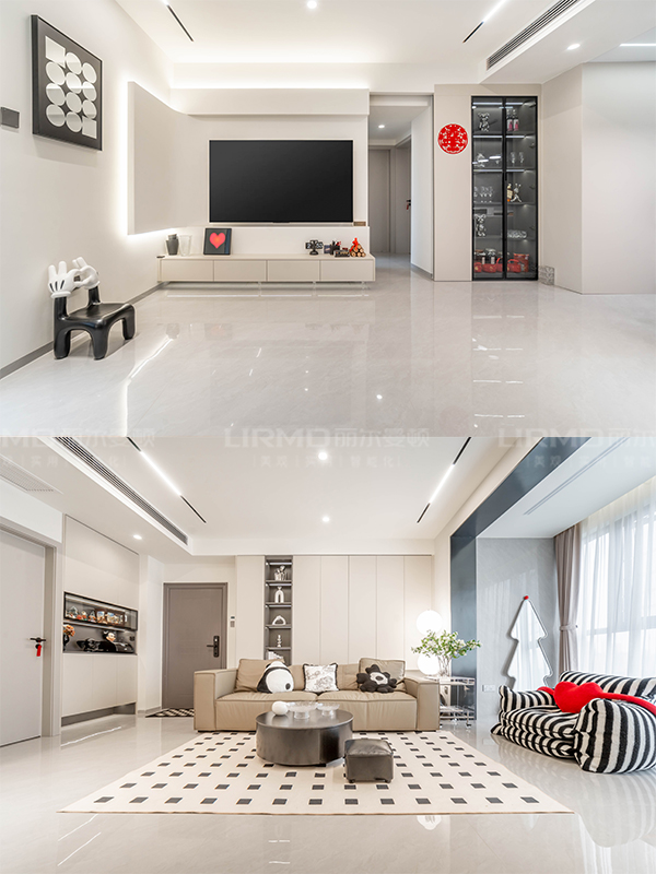 客廳做轉(zhuǎn)角的懸浮電視背景墻,搭配滿墻沙發(fā)背景收納柜,美觀整潔收納能力強(qiáng)