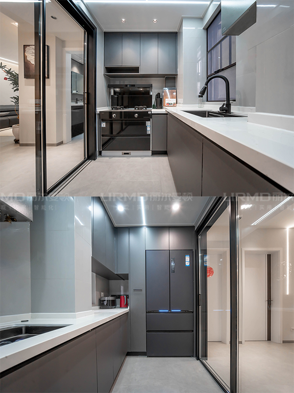 統(tǒng)一配置超高房門,L型櫥柜均采用5大系統(tǒng)定制,高低臺面滿足人體工程學設計