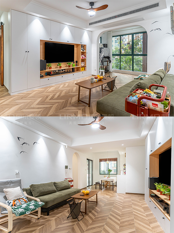 滿墻電視背景柜、獨(dú)立式書房、全屋通鋪魚骨紋瓷磚至陽臺,搭配復(fù)古吊燈