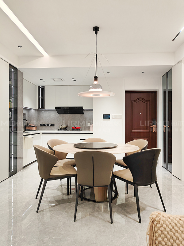 全屋通鋪 750×1500 瓷磚,整體通透大氣,L 型極簡懸空電視柜又簡潔大方還十分便捷,