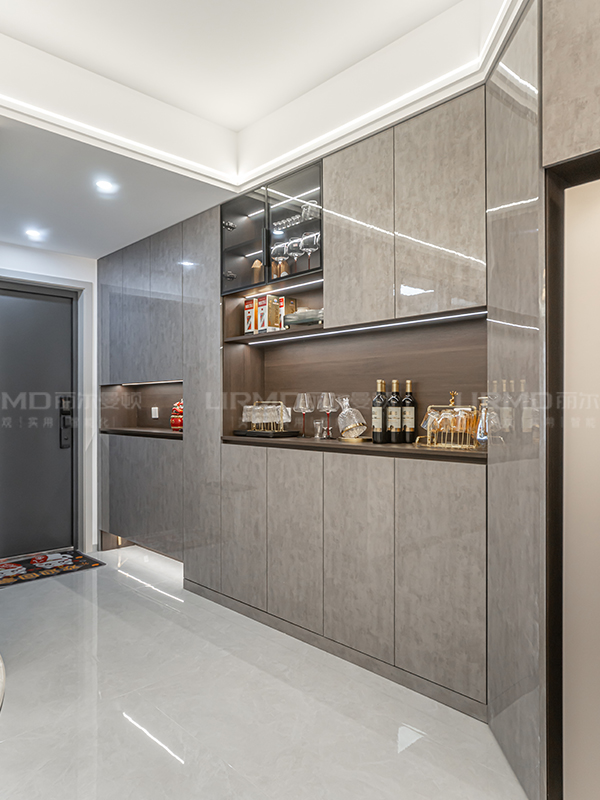 全屋門墻柜一體化,采用深石紋+深色木飾面的搭配,讓空間不沉悶又有層次感