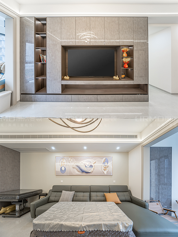 回字電視背景墻,區(qū)域劃分明顯,增加收納和展示空間,實用率直線上升