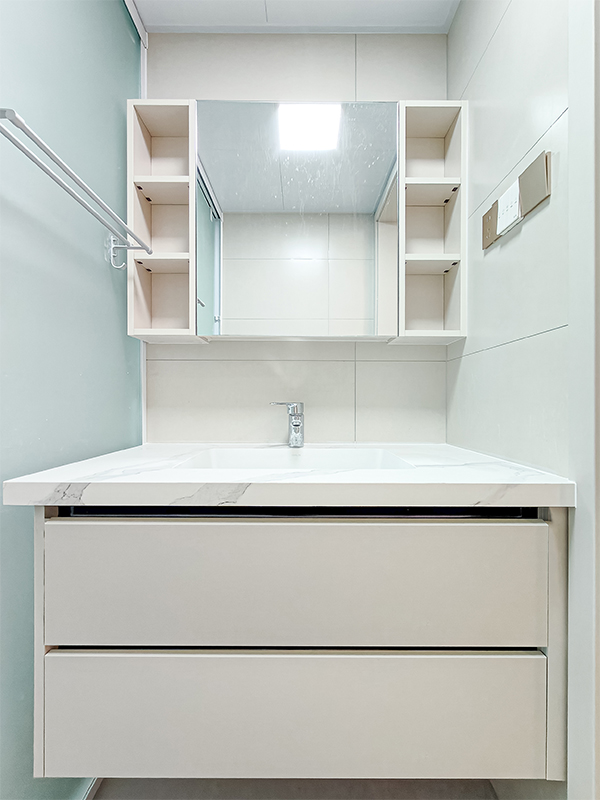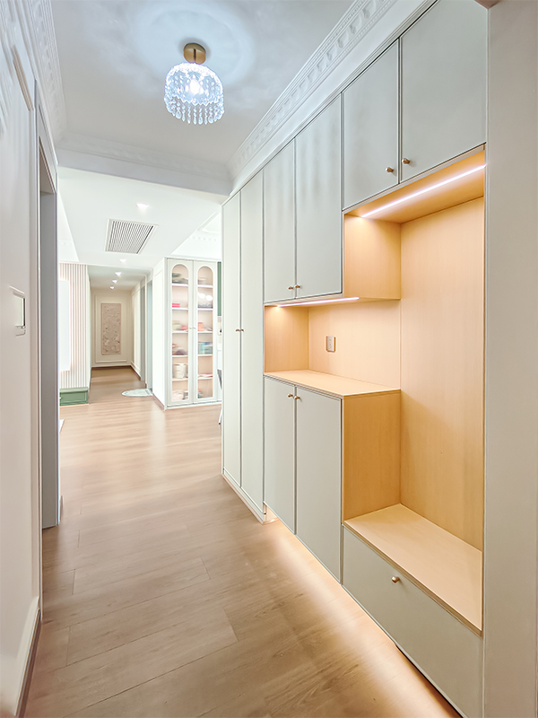 全房用大面積的淺奶油灰色,但在質感上做出凹凸門格柵板等不同的表現形式,細節處處體現質感