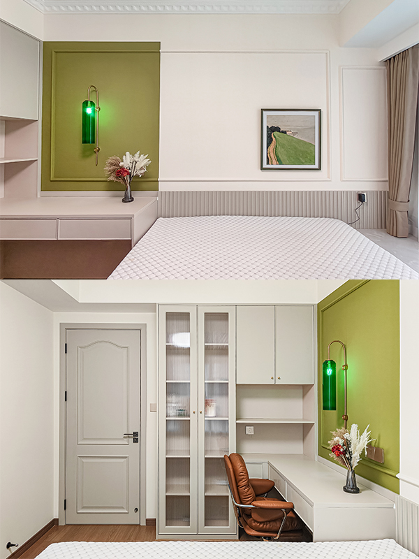 淡奶油色的墻面+地面木地板橄欖綠,跳脫出傳統現代法式的淺色單一元素,給法式的優雅增添一份清新的美感