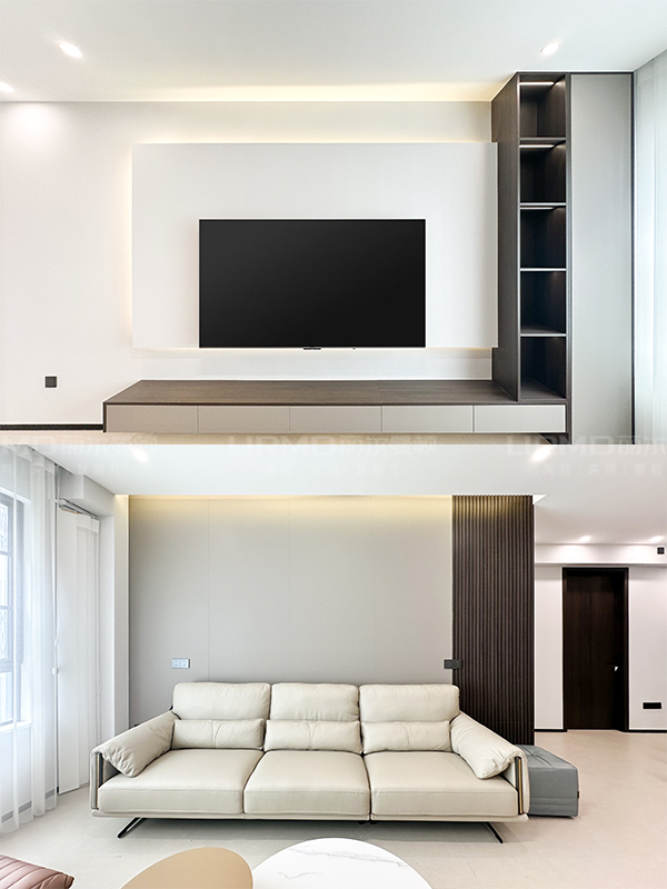 電視背景墻柜子設(shè)計開放格放擺件增加格調(diào),酒柜開放格往里縮增加層次感