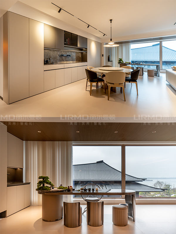 客餐廳空間開闊大氣,木飾面巖板背景墻搭配無拉手柜門又美觀又實用