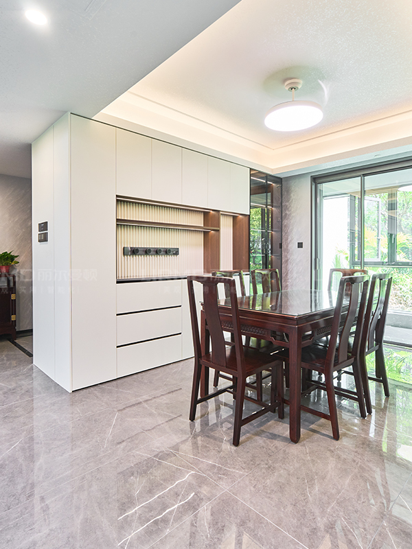餐邊柜采用多功能分區設計,開放區、大抽屜以及收納柜,充分滿足不同物品的收納需求