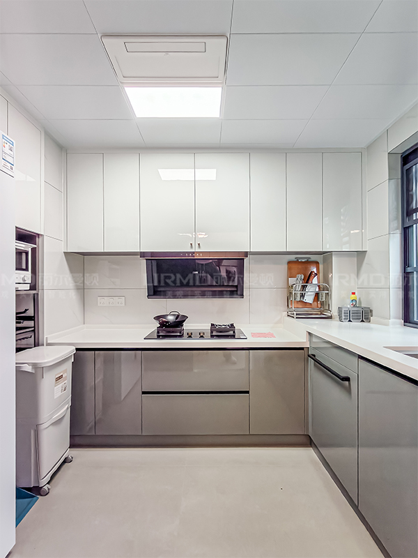 櫥柜采用上淺下深, U 型布局,洗滌區(qū)、烹飪區(qū)及操作臺等空間劃分極其明確