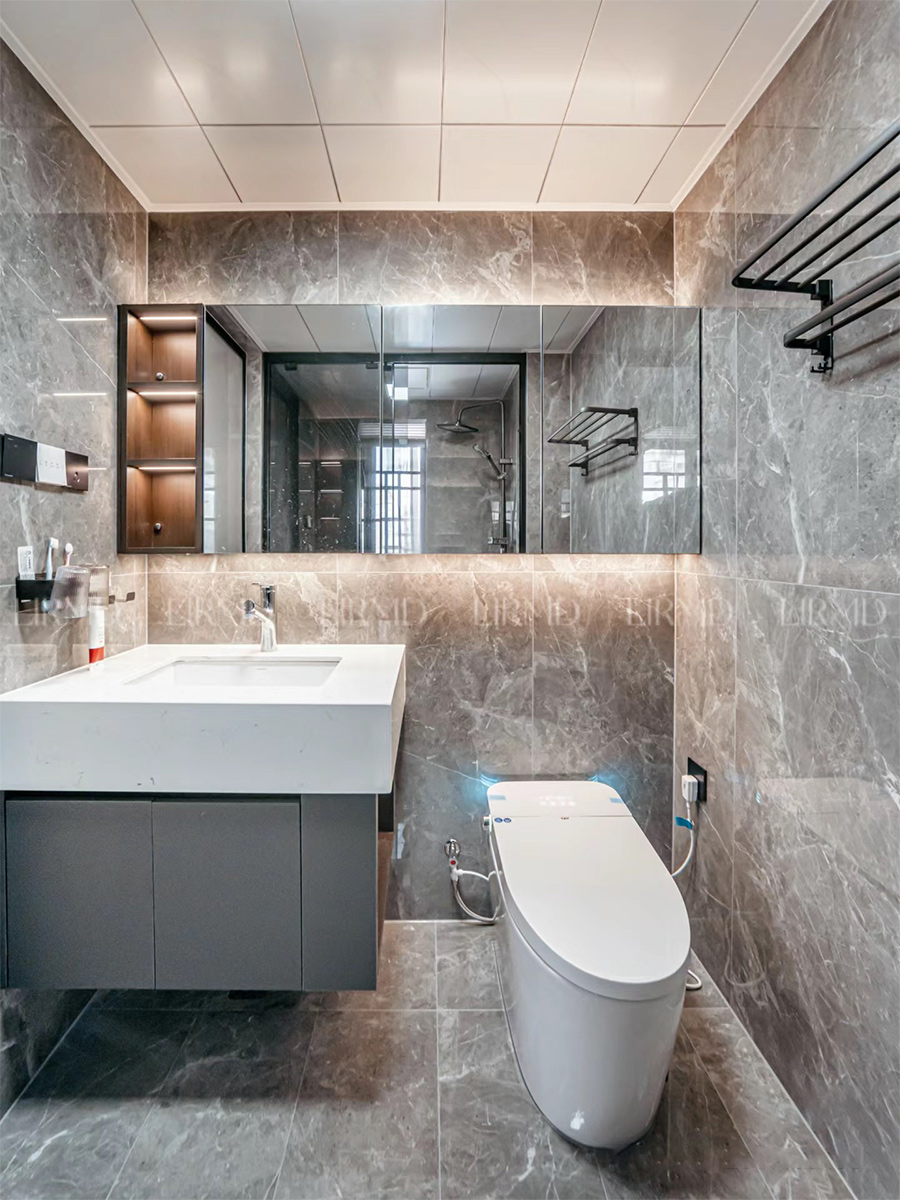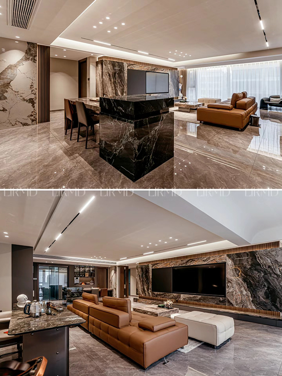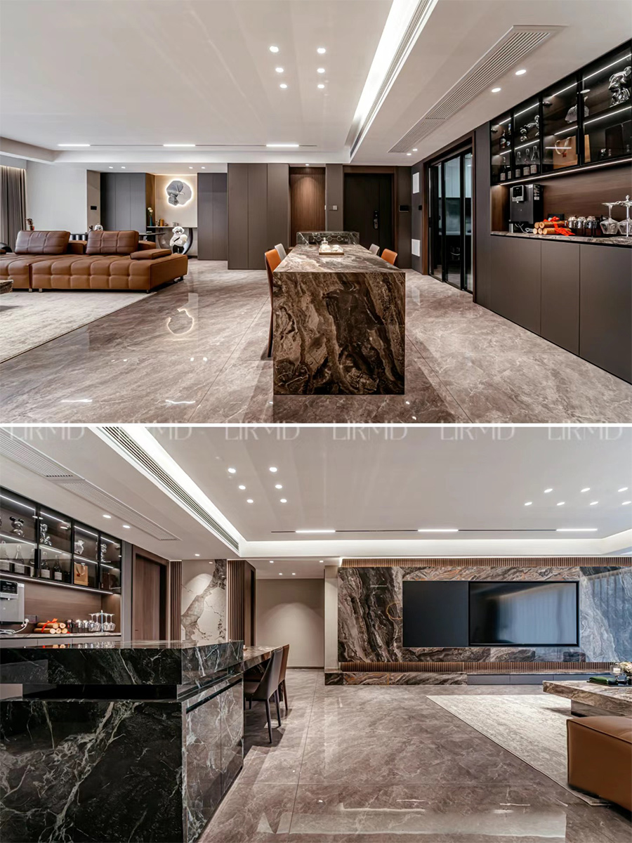 輕于形 奢于質(zhì) 意式輕奢 整體色調(diào)高級(jí)深灰色調(diào)搭配,用巖板打破整體空間深沉感,讓空間層次和效果體現(xiàn)更高級(jí)感。