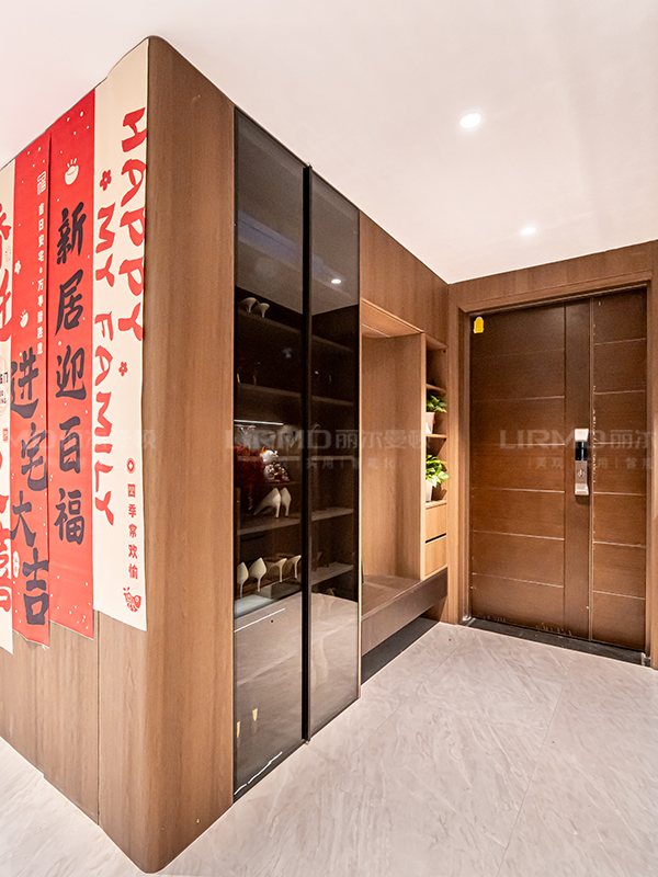 護墻板與大理石材質結合,搭配大圓弧工藝+金屬質感玻璃門裝飾,展現高級質感。