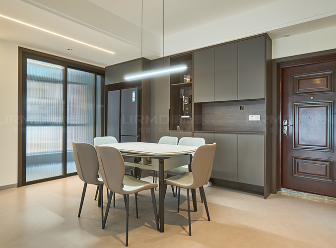 餐廳做同款餐邊柜,入戶收納+飲水機+冰箱實現多功能化,中間預留管線設計,下方懸空設計,