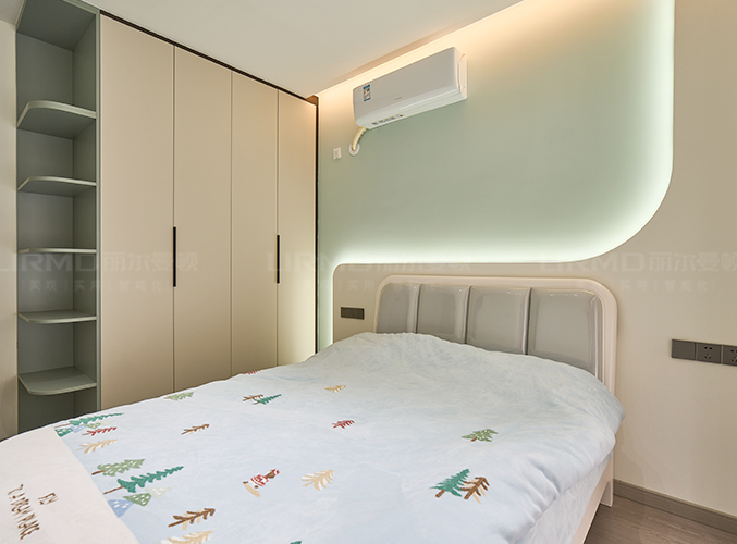 主臥延續低飽和度色系+深灰色一柜到頂衣柜,床頭裝木紋板搭配暖色氛圍燈烘托安靜柔和的氛圍,