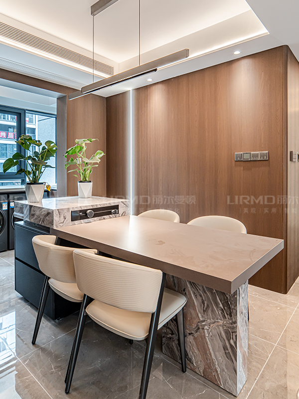 意式輕奢風格,深淺咖色搭配,搭配無主燈吊頂高端巖板,讓整個空間顯得高大上