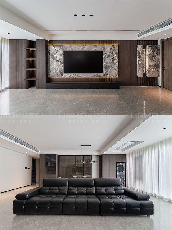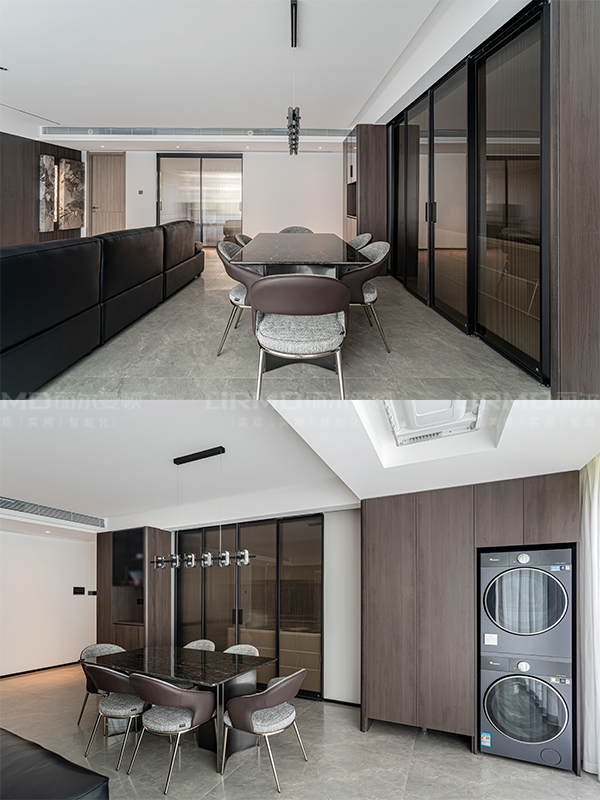 客廳采用煙熏尤加利深色調,嵌入式電器配合巖板背景墻、奢石餐桌,增加了豪華感。