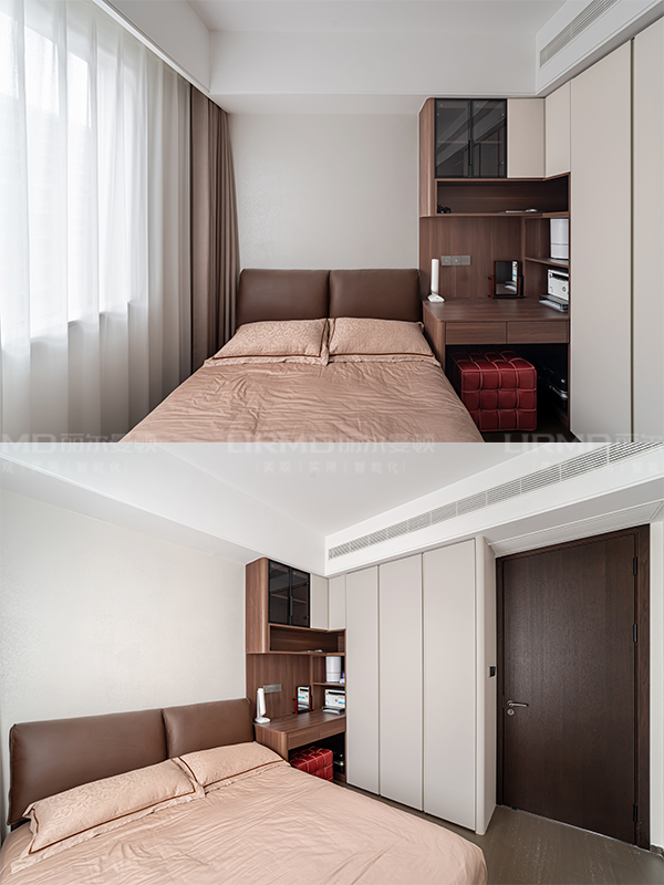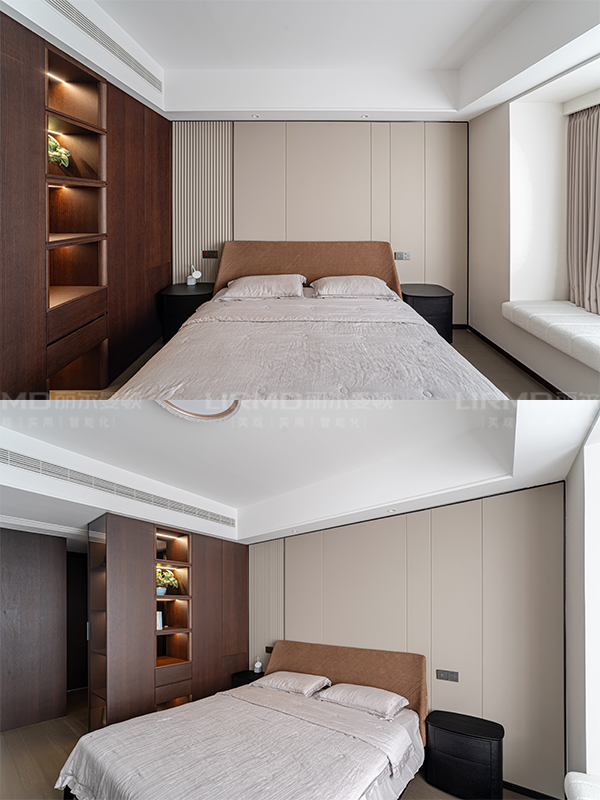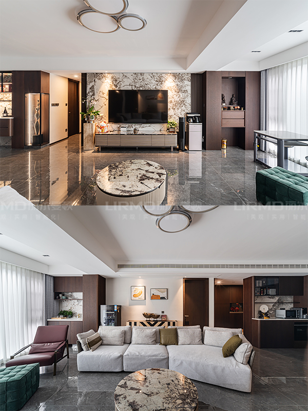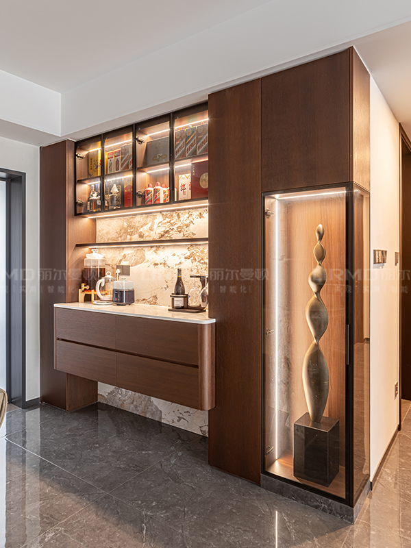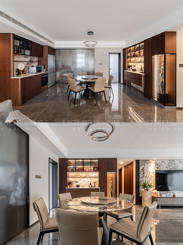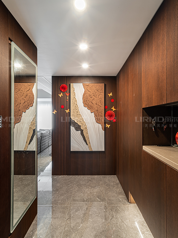 傳統與現代的平衡術跳出傳統中式厚重感,以原木貼皮+巖板為主材,現代線條勾勒雅致韻味。